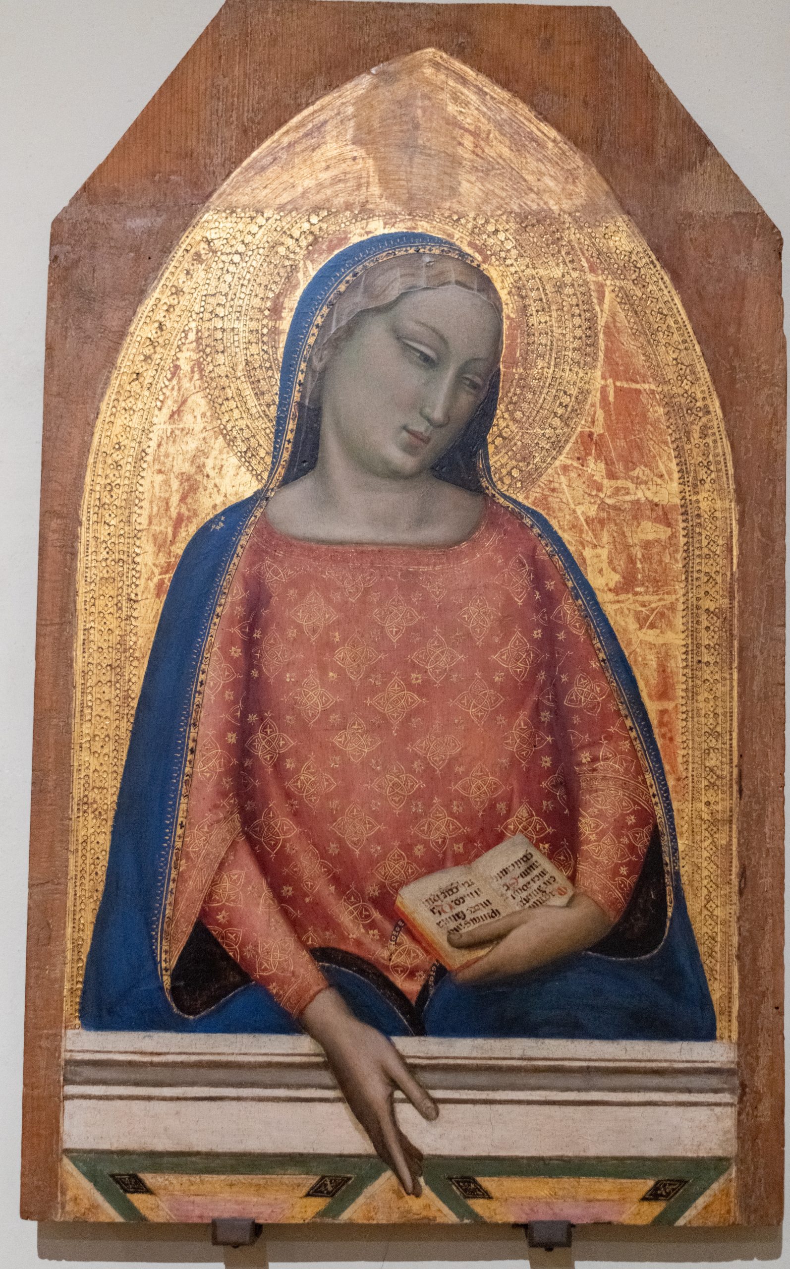 Mary, wearing simple red patterned dress with blue headress and shawl, holding a book inscribed with Magnificat.