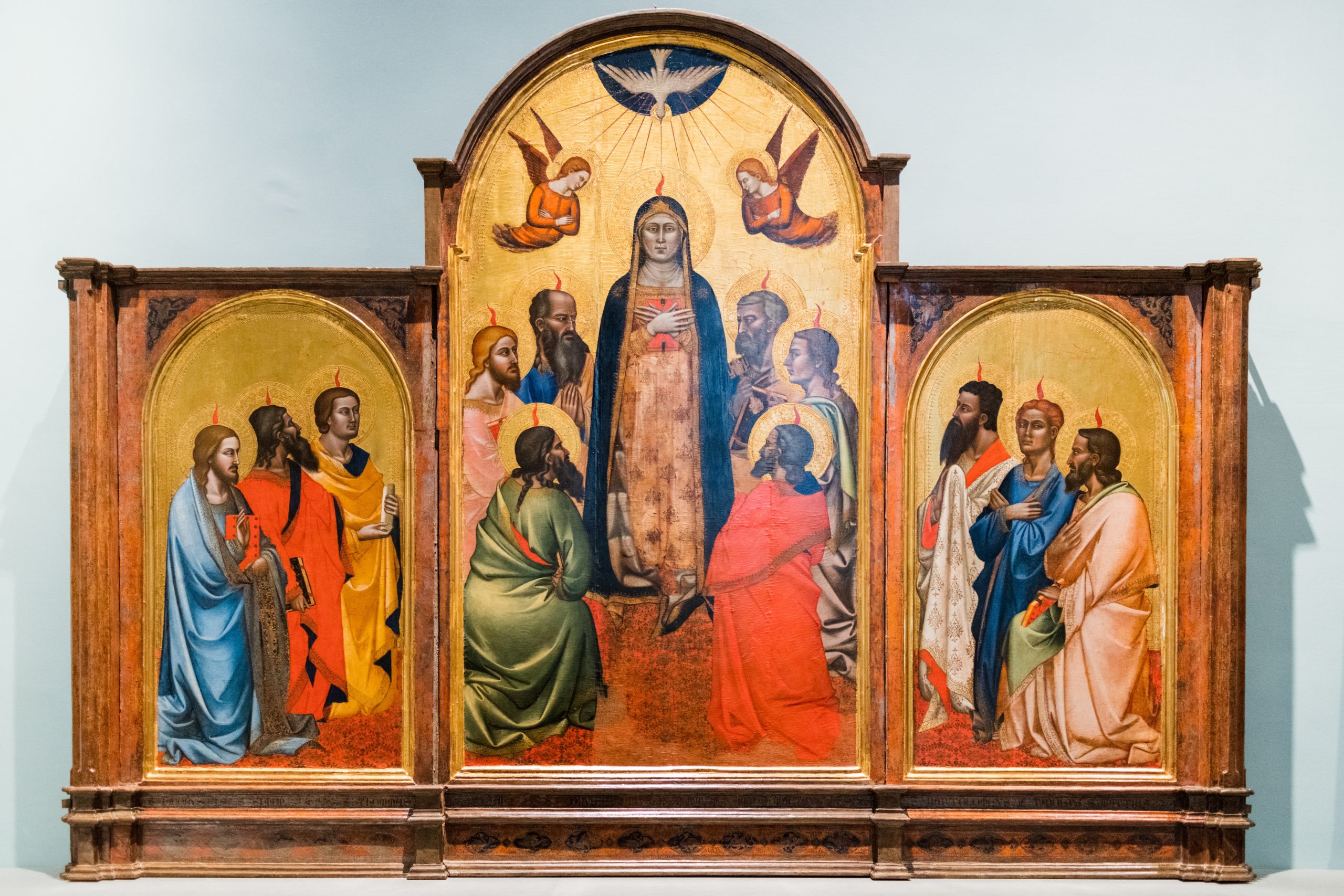 Mary appears as central figure in this depiction of Pentecost when the Holy Spirit, depicted as white bird, descended in the form of tongues of fire. Pentecost is not frequent theme in art, especially after Middle Ages. Mary's vertical presence dominates the space with the six kneeling apostles around her. She is clasping a red book in front of her. In the outer panels of the triptych, three apostles converge toward Mary in center panel. One of the apostles looks toward viewer, drawing us into the scene. Two angels in flight are witnesses of event. The image is austere with little decoration except for the frame and the fabric lining the floor. The artist was likely an architect and sculptor as well, given the measure and balance of the work. Originally housed in the high altar of the Church of Santi Apostoli in Florence.
