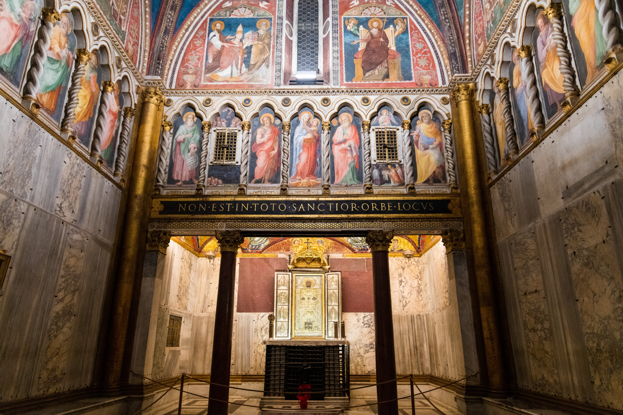 The small chapel, called the Holy of Holies (Sancta Sanctorum) is comprised of a gothic-styled altar room and main room. Access is restricted; visitors may view only through grilled windows. The main room features 13th century frescoes that narrate the martyrdoms of apostles Peter, Paul, Stephen, and saints Lawrence and Agnes. The altar room preserves precious relics from the 9th century and the portrait of Jesus which was painted by angels according to medieval legend. Additionally, the altar room features 13th century golden mosaics of Peter, Paul, Lawrence, and Agnes.